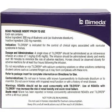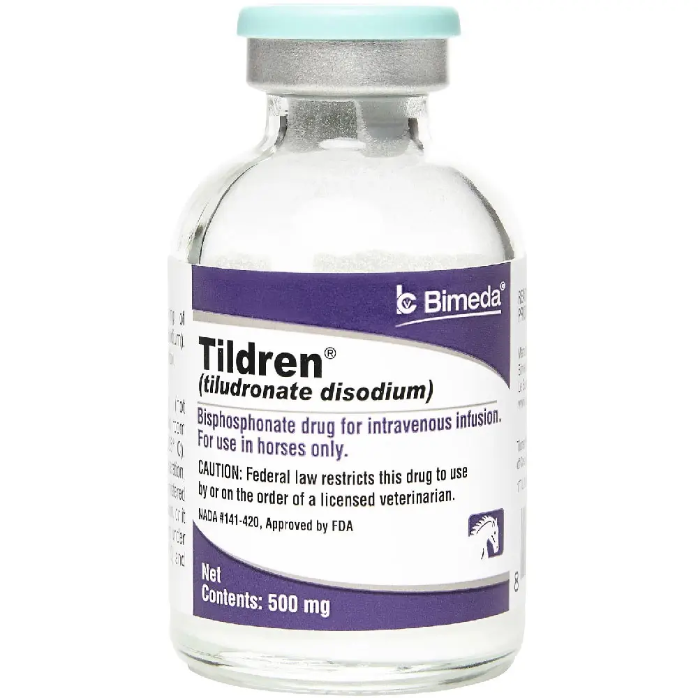 Tildren (tiludronate disodium) is a powerful bisphosphonate medication used in horses to manage navicular disease, bone resorption problems, and chronic lameness. It helps reduce pain and inflammation caused by excessive bone remodeling. Each package contains 10 × 5mg/ml vials, suitable for controlled IV infusion by a licensed veterinary professional.